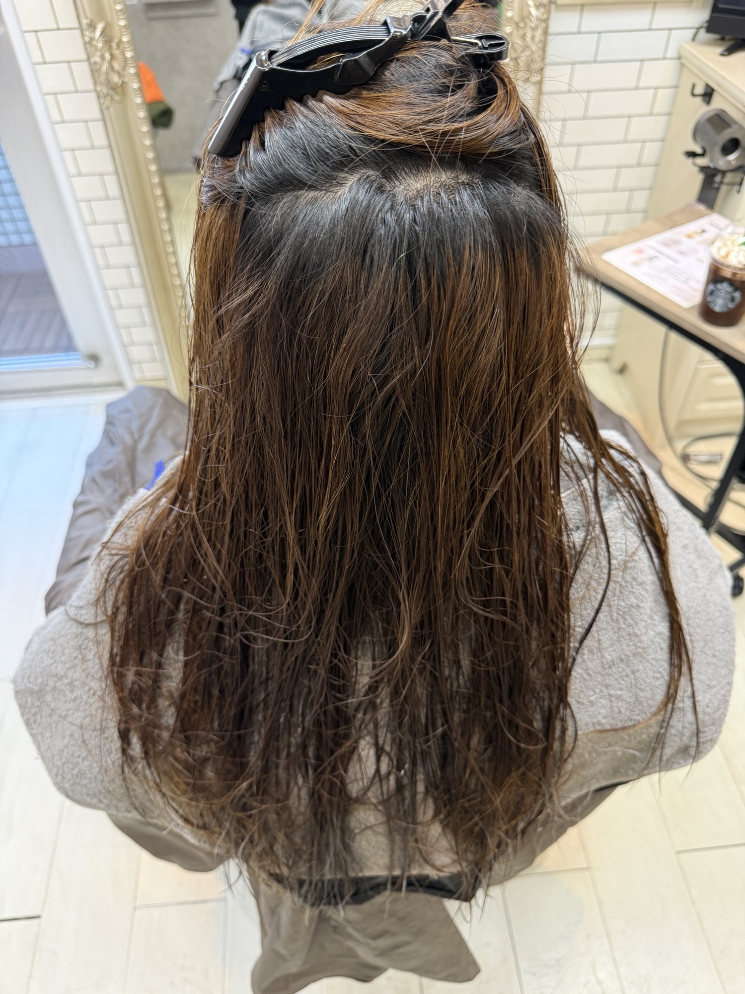 ロングヘアの縮毛矯正。髪質によって薬剤のタイプを変えています。